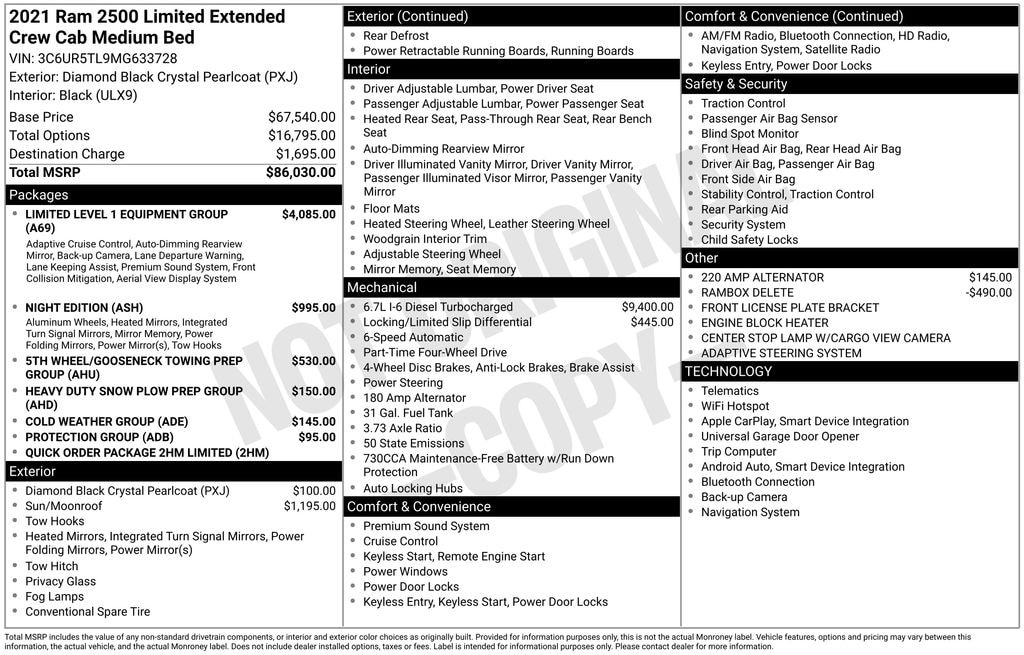 Whether you're tackling tough jobs or embarking on epic adventures, this 2021 Ram 2500 Limited is built to exceed your expectations. The powerful Cummins diesel engine, combined with the rugged 4x4 drivetrain, ensures you'll have the confidence to conquer any terrain. The expansive cabin offers ample space and luxurious appointments, making every journey a truly comfortable and enjoyable experience.