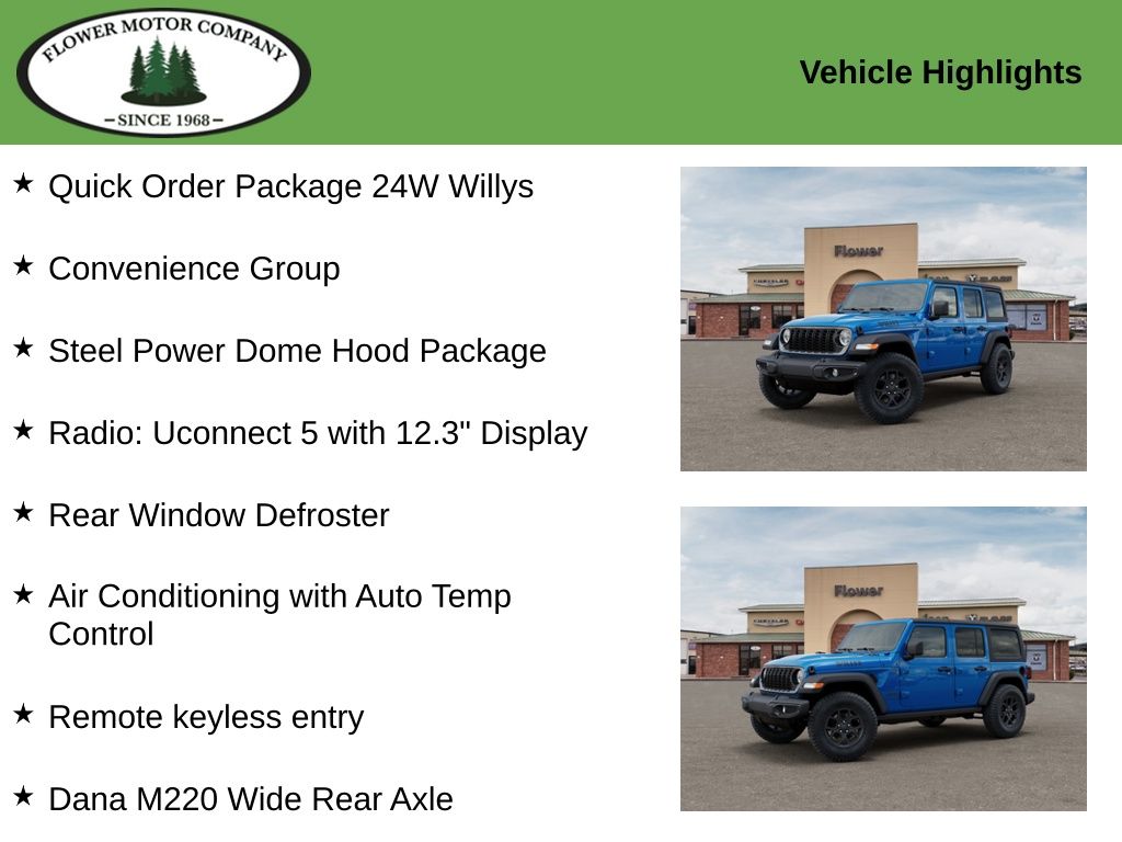 Visit Flower Motor Company today and let us demonstrate the impressive capabilities of this 2026 Jeep Wrangler Willys. Our knowledgeable sales team is eager to answer your questions and help you discover the perfect vehicle to suit your lifestyle. We're confident you'll be impressed by the quality, performance, and value this Wrangler has to offer.