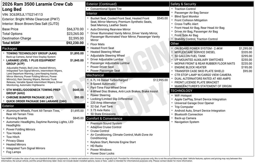 This 2026 Ram 3500 Laramie is packed with cutting-edge technology, including GPS Navigation, Apple CarPlay/Android Auto, Dual Wireless Charging Pads, Heated Steering Wheel, and Surround View Camera System. The Leather-Trimmed Bucket Seats with Ventilated Front Seats offer unparalleled comfort, while the 50-Gallon Fuel Tank provides extended range for your journeys.