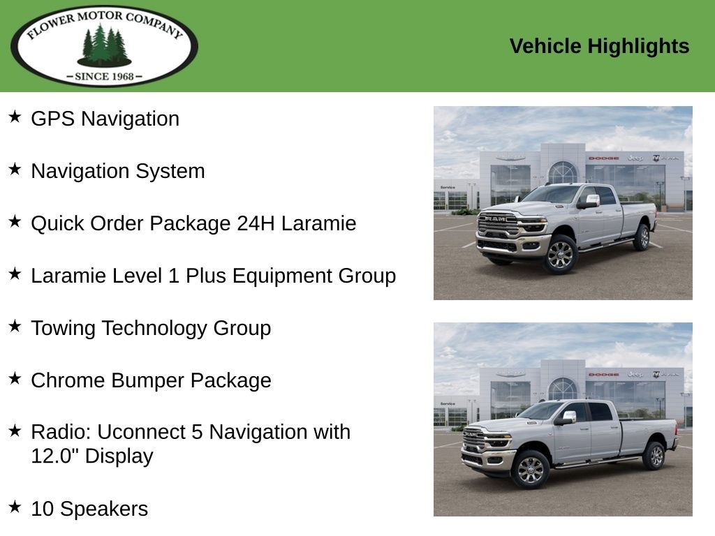 Whether you're tackling tough jobs or embarking on epic adventures, this 2026 Ram 3500 Laramie is the perfect companion. Experience the perfect blend of power, capability, and premium features that will elevate your driving experience. Visit us at Flower Motor Company today to take this remarkable truck for a test drive.