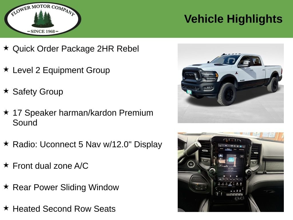 This stunning 2024 Ram 2500 Rebel is a true off-road powerhouse, engineered to conquer even the most challenging terrain. Boasting a Cummins 6.7L I6 Turbodiesel engine paired with a 6-speed automatic transmission and 4-wheel drive, this truck delivers exceptional performance and capability.